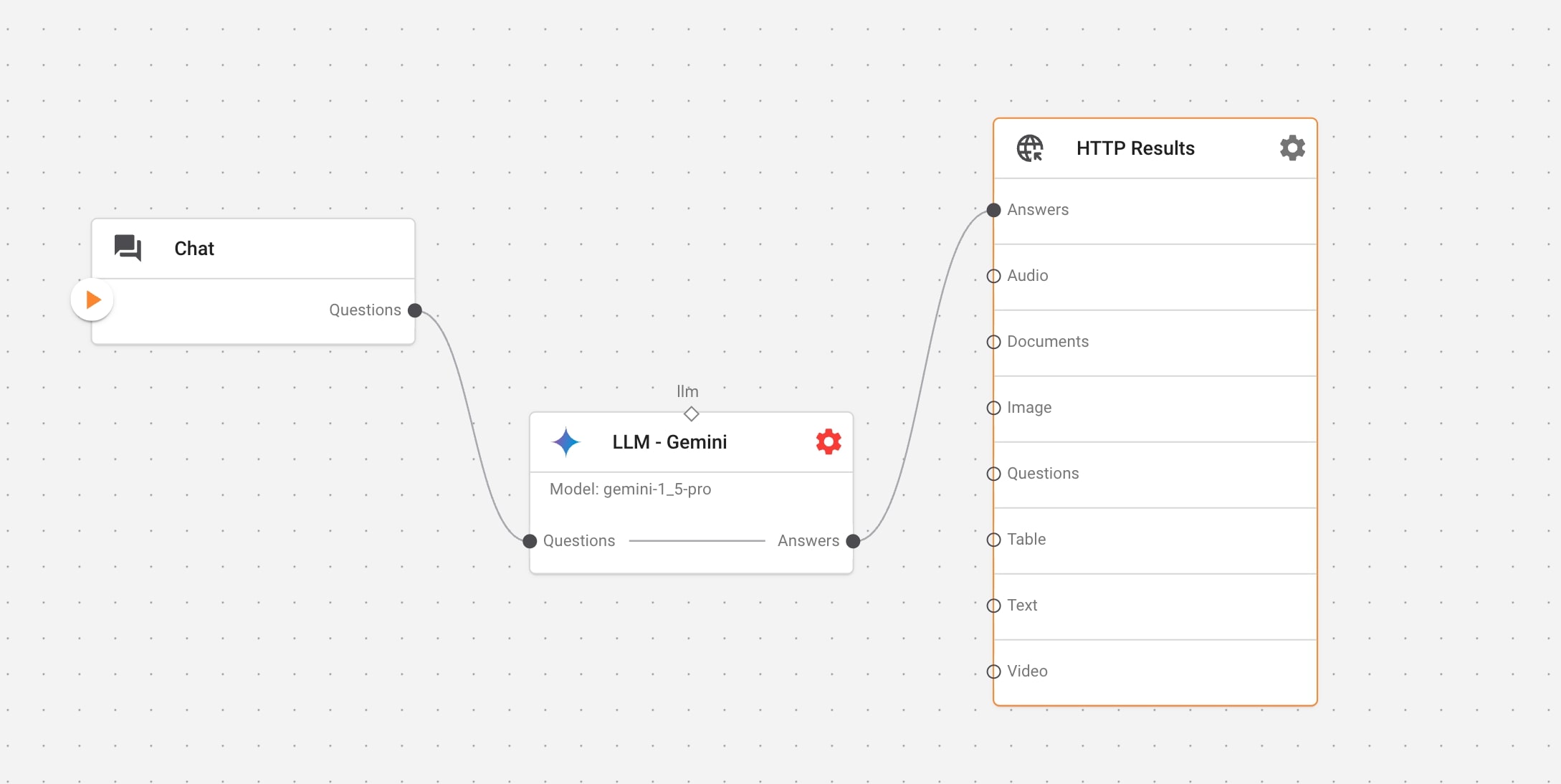 This is a basic conversational AI pipeline using Google Gemini as the LLM, which captures user questions and triggers the flow.