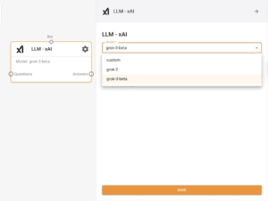The xAI node allows connection to xAI’s language models for processing natural language questions and generating responses. This node is used to send prompts to a specified model and return text-based answers via token-based authentication.