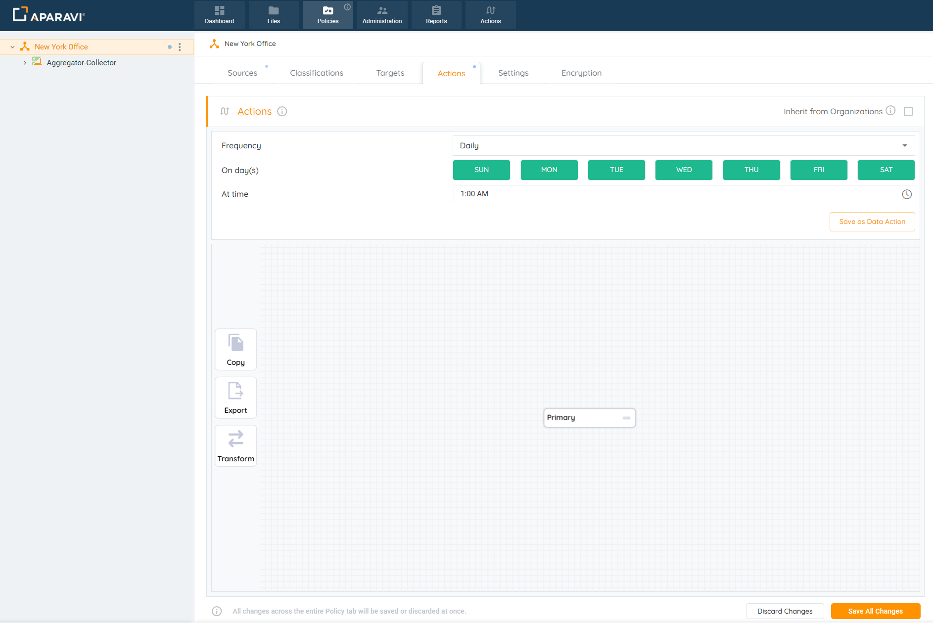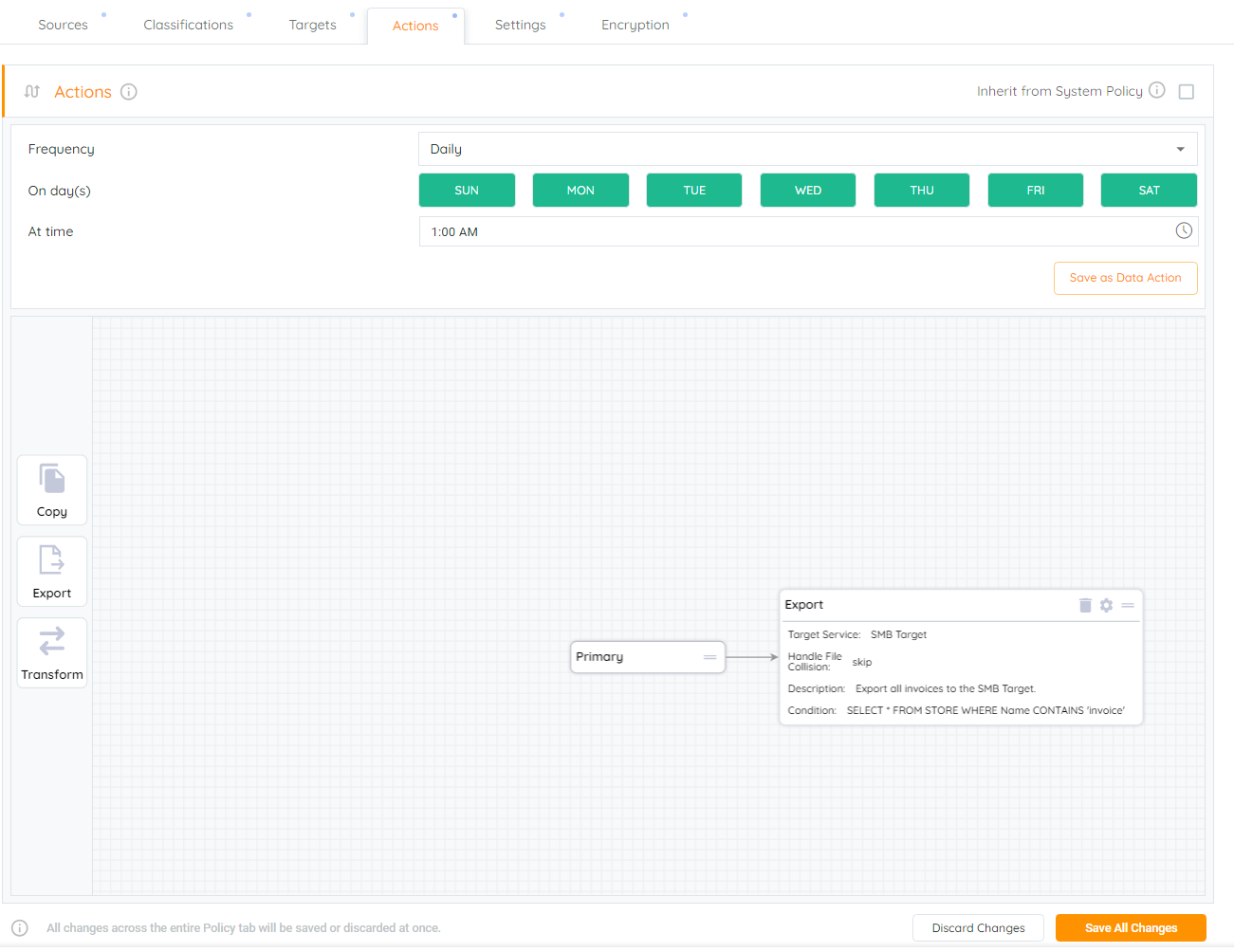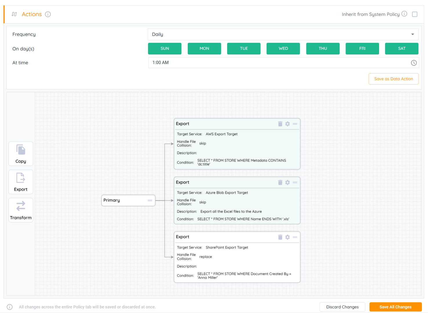 Save the configured export action query by confirming on the Save Changes.- This action will send the most recent scanned version of the file to the target. From this point on, the system will copy the selected files to the target service specified, on the time interval chosen.