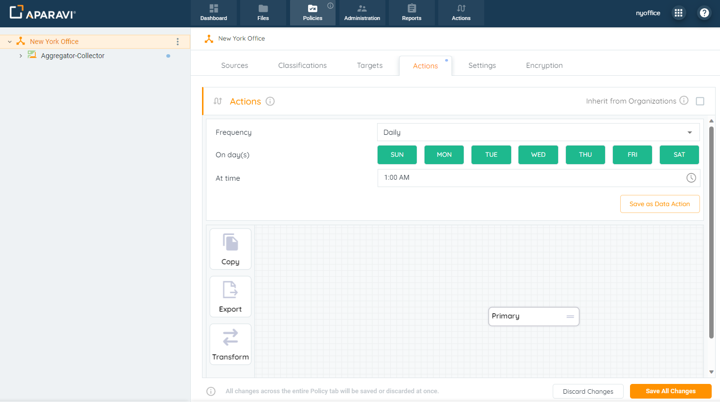 Nodes nested under organizations have the ability to inherit the actions that have been configured, or set up their own. By default, any new nodes will automatically inherit from the organization above. If new nodes want to configure their own actions, this inheritance policy will need to be deselected upon installation.