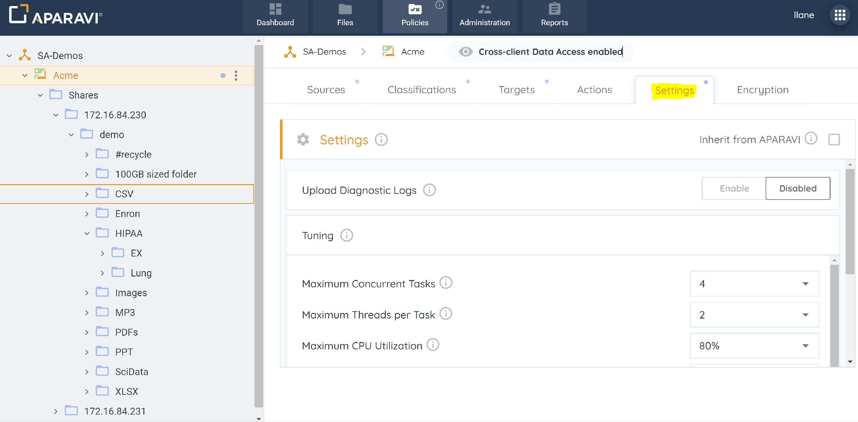 Access Settings by clicking “Policies” in the ribbon menu, then the Settings tab. Options are initially grayed out due to inherited policies; keep the default or uncheck “Inherited from Organizations” to customize. Click ‘Save All Changes’ at the bottom left to apply.