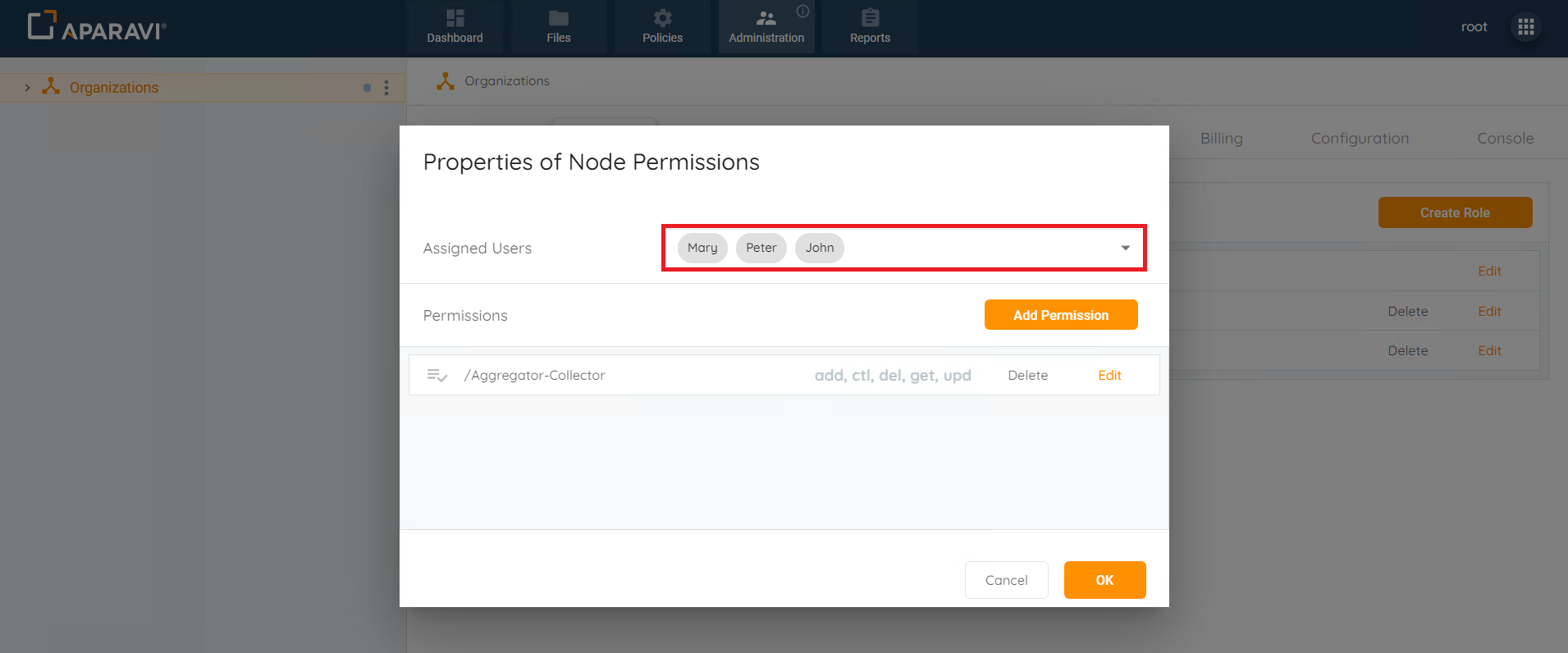 Upon installation, the Aparavi system generates an Administrative account with full permissions, enabling the addition/removal of users. Administrative users can set custom permissions for precise control over user access to specific nodes.