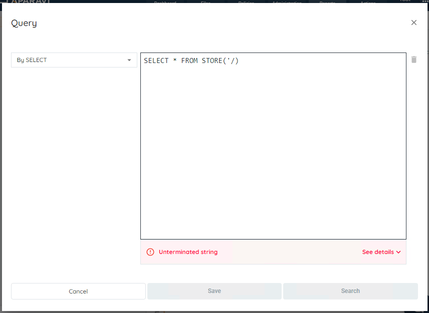 Aparavi Querying Language (AQL) is a SQL-92 compliant language that uses Node.js with SQL Common Table Expressions (CTEs) to provide a scalable way to query against your data no matter where it is. Node.js is used to build and pass queries between aggregators, while SQL CTE’s provide the ability to query across multiple tables and their columns. All of this is done behind the scenes while querying, similar to many popular SQL languages.