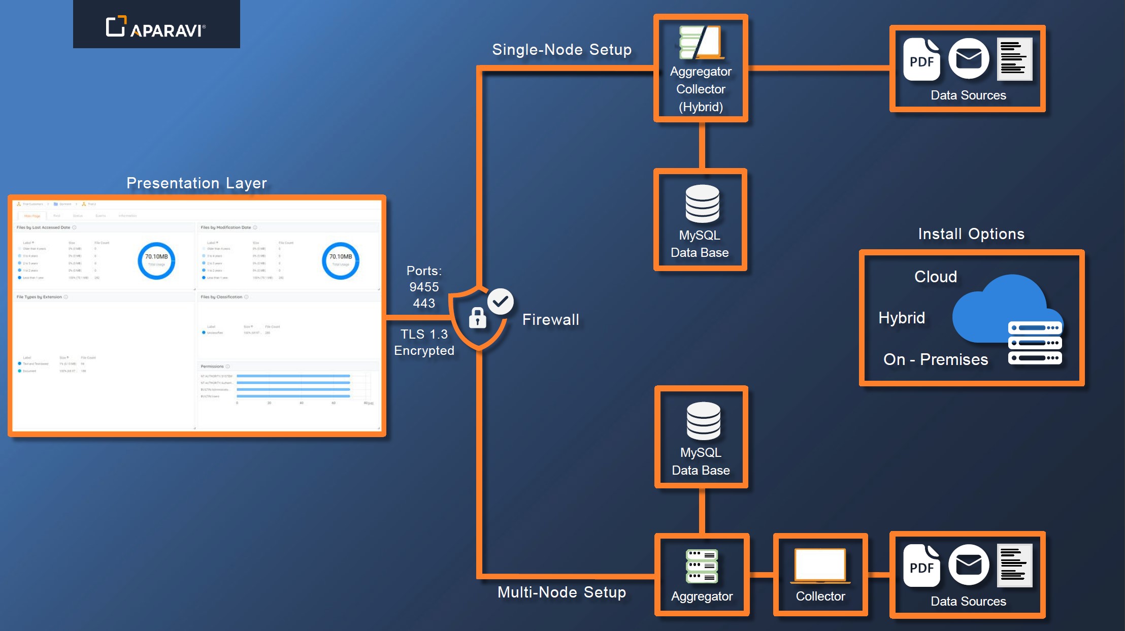 This layer communicates to the aggregator via TLS1.3, HTTPS (443) APARAVI Port (9544). These ports need to be opened on the firewall where the aggregator is installed.