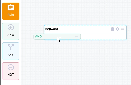 By dragging an AND operator over our KEYWORD rule, we can start to create more complex criteria. A and B and C or D or E. Based on how you arrange the AND/OR/NOT operators, you can create complex rules like ((A and B) or (C and D) or E) and (NOT F). In this case both A and B would be true…OR both C and D would be true…OR E would be true…AND, no matter which of the 3 were true, F is false (NOT true).