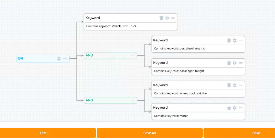- In this example, your document, in order to achieve a Motor Vehicle classification, must have VEHICLE/CAR/TRUCK OR (GAS/DIESEL/ELECTRIC AND PASSENGER FREIGHT) OR (WHEEL/TRACK/SKI/TIRE AND MOTOR). Or put another way, either says it’s a VEHICLE or CAR or TRUCK, OR a GAS FREIGHT or a WHEEL MOTOR, etc.