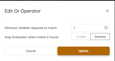 By clicking on the GEAR icon on the OR, you can define the rules for the OR.- A or B or C – how many have to be true;