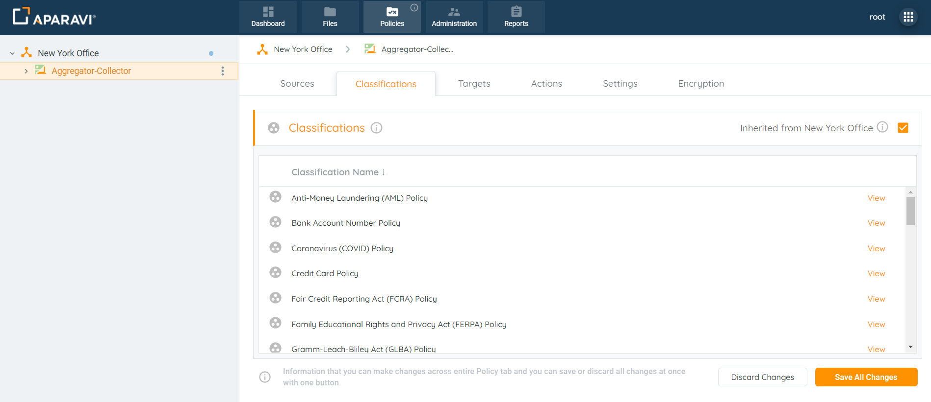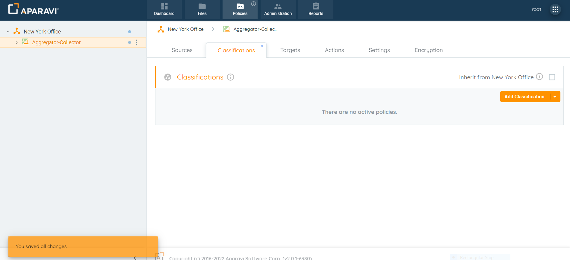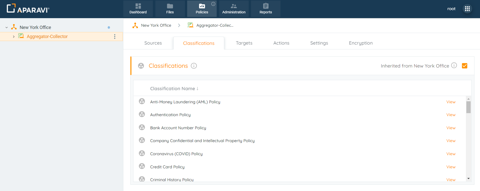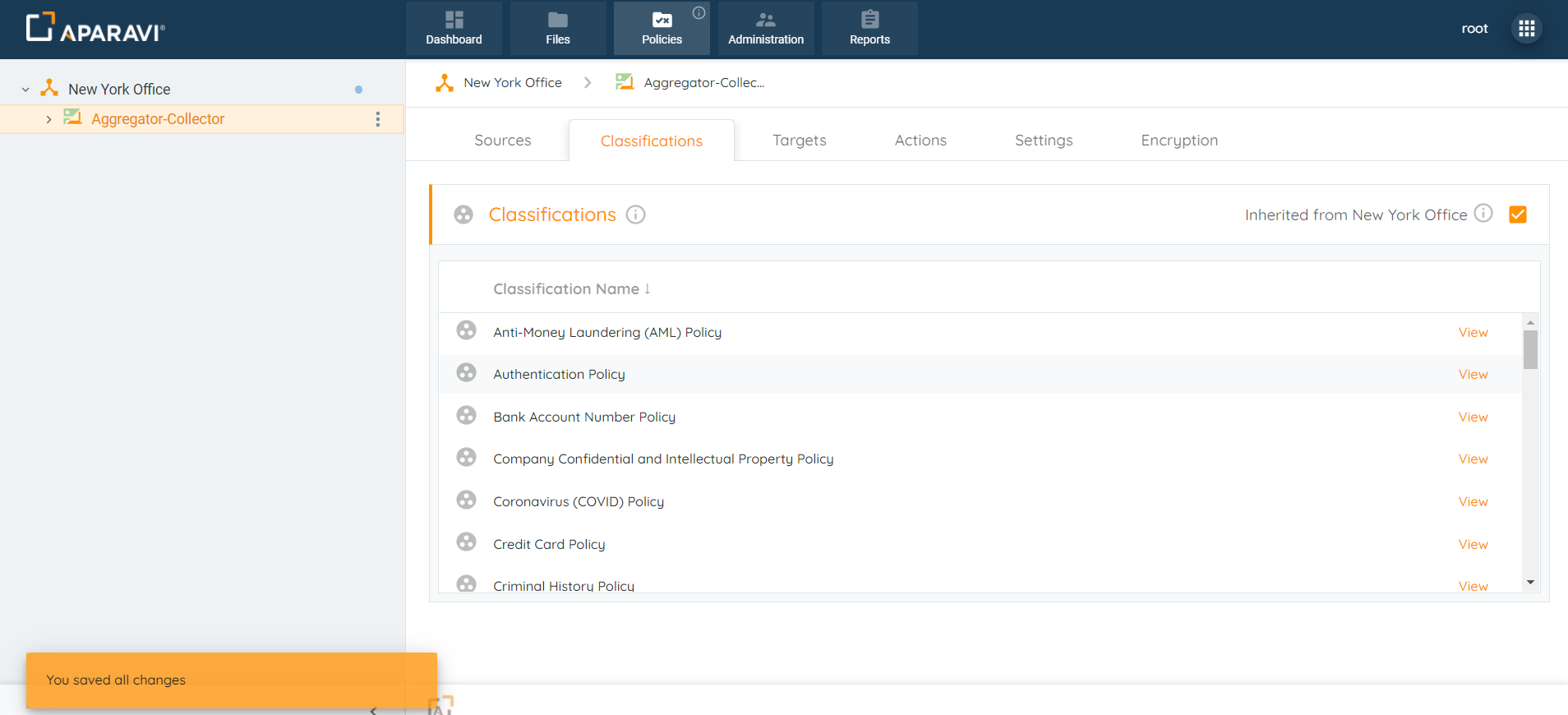 - Once the classifications have been applied, all inherited classification policies for the node above will automatically be activated for the node below.
