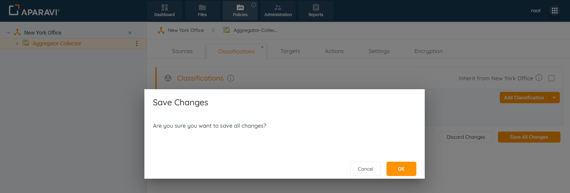 Once the Save All Changes button has been selected, a pop-up box will appear asking to confirm all new classification policies.