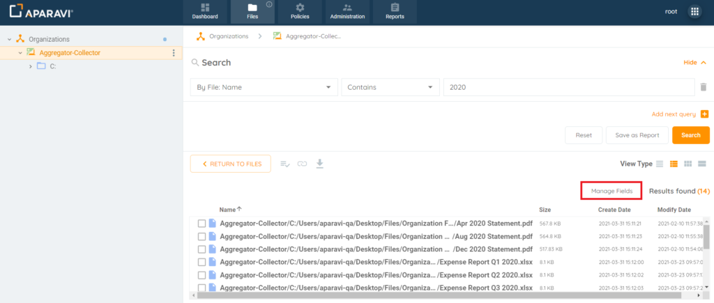 Details View- Click the Manage Fields button, located in the top right-hand corner, directly above the file results. Once clicked, the Manage Fields pop-up box will appear.