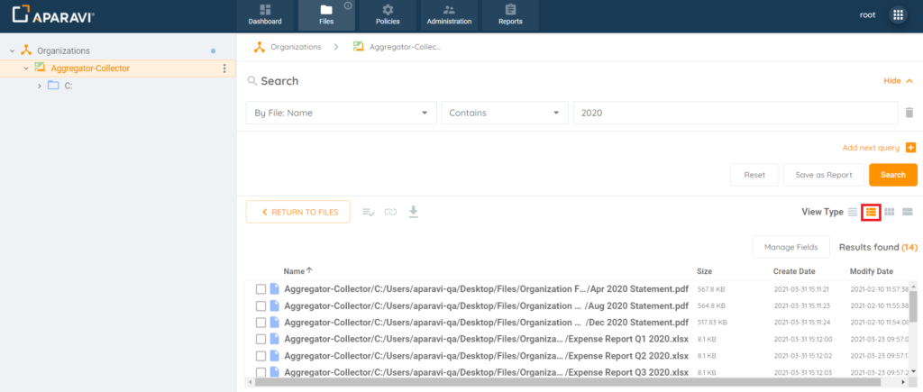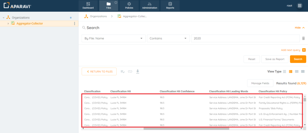 - Once files are classified using the classification policies saved in the system, the classified files are searchable by their classifications on the Files tab and Reports tab. When searching for files, several fields can be added to display not only the name of the classification triggered by a file, but also regarding the content within the file that triggered the classification policy to begin with. Once the search or query is performed, the details for the classification file contents display directly on the screen showing data such as, the content that triggered the classification policy and even the rule within that classification policy that was triggered by that content.