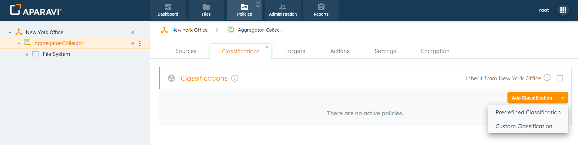 - Click on the Policies tab in the top navigation menu and then click on the Classifications subtab.