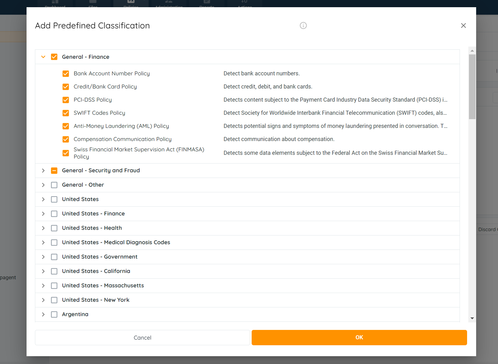 The Add Predefined Classification policies pop-up box will appear with a list of all the options to choose from.- Any of the classifications that contain a chevron indicates that there are additional policies to choose from within that policy.