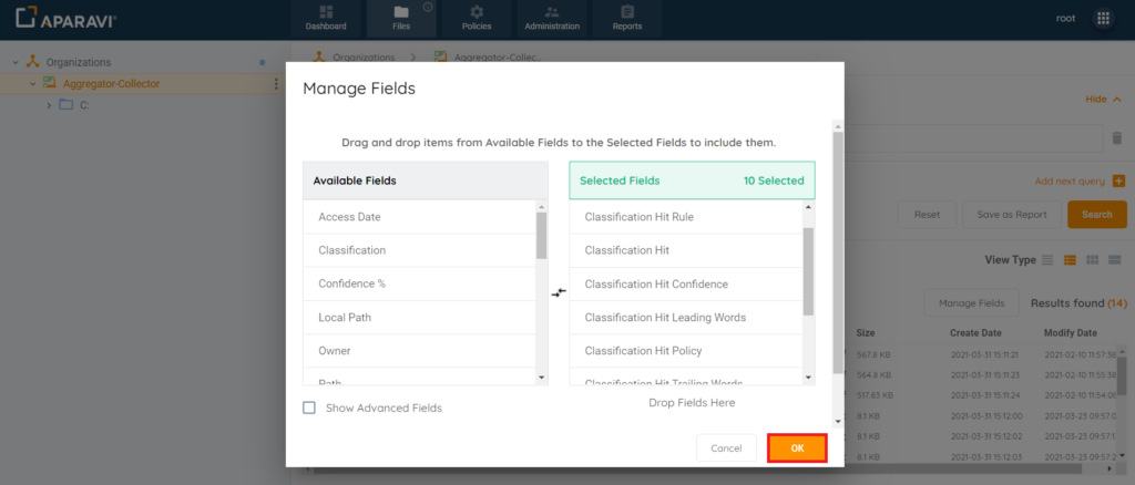 Manage Fields Button- Click on the Classification hit field, located under the Available Fields column, drag it over into the Selected Fields column. Once the Classification Hits field has been successfully added, it will appear under the Selected Fields column and no longer display under the Available Fields column.