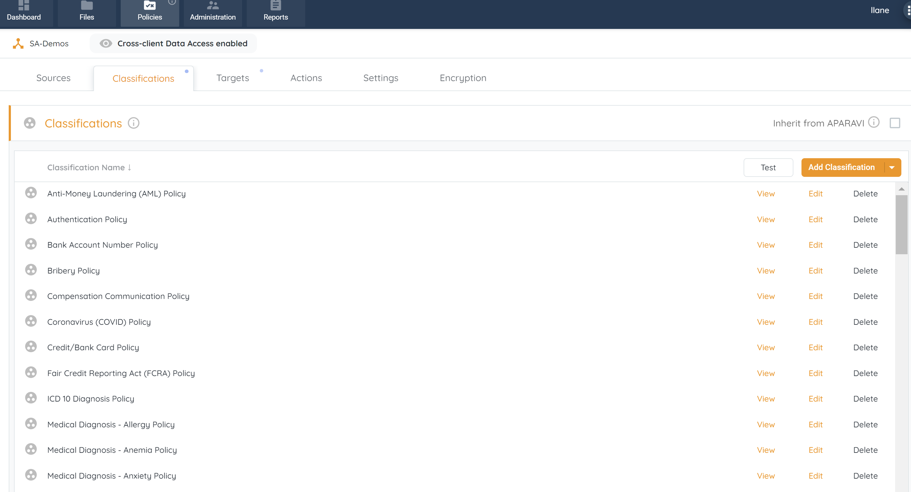 - Login on your client level in the APARAVI platform, navigate to the βPoliciesβ menu, and select the βClassificationsβ tab.