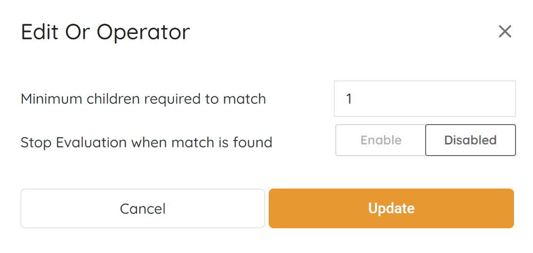 Edit Or Operator pop-up- Within the Operator editor, you will be able to make changes to the set rule: