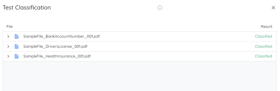 - Within this window, you will be able to see if the document was classified or not by the selected classifications, as seen in the above example. Click on the arrows to the left of the file name to see what classifications had been triggered.
