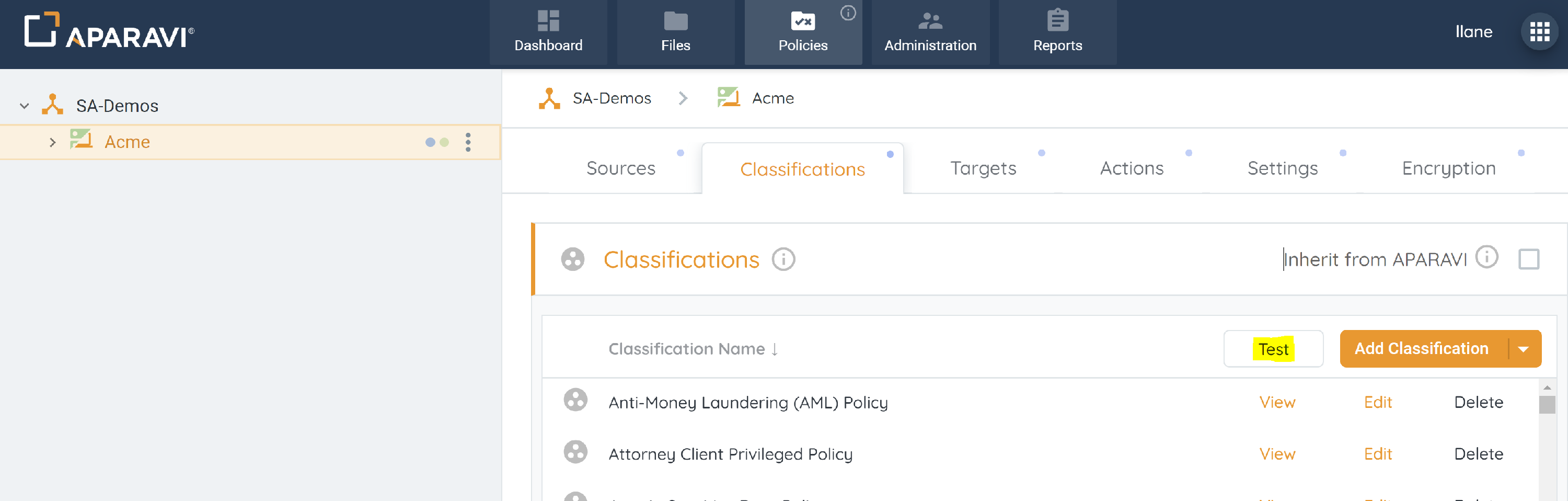 - Login on your client level in the APARAVI platform, navigate to the Policies menu and select the Classifications tab.