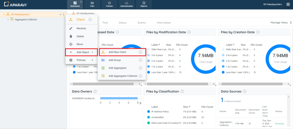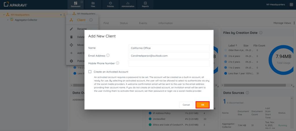 Once the new client has been added, the client will appear in the navigation tree under the Organization/Client that was chosen when the new client was created. At this point, the user will receive an email to configure their account. The red dot to the right of the client’s name will turn blue once the account has been activated.
