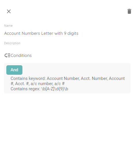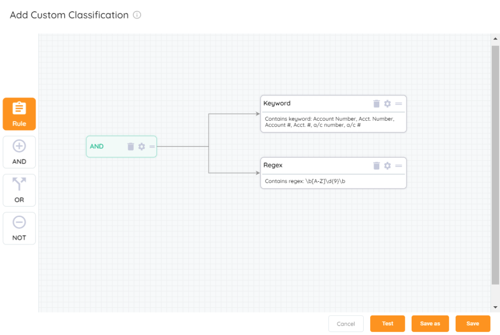What’s great is we can now combine the custom rule needed for keyword along with the rule for Regex to completely cover finding data that contains that information based on the unique account number. The complete custom classification rule would consist of an AND statement looking for both, looking like this: