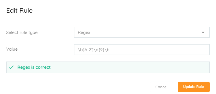 - \b[A-Z]\d{9}\b – looks for a value that contains a letter, then 9 digits