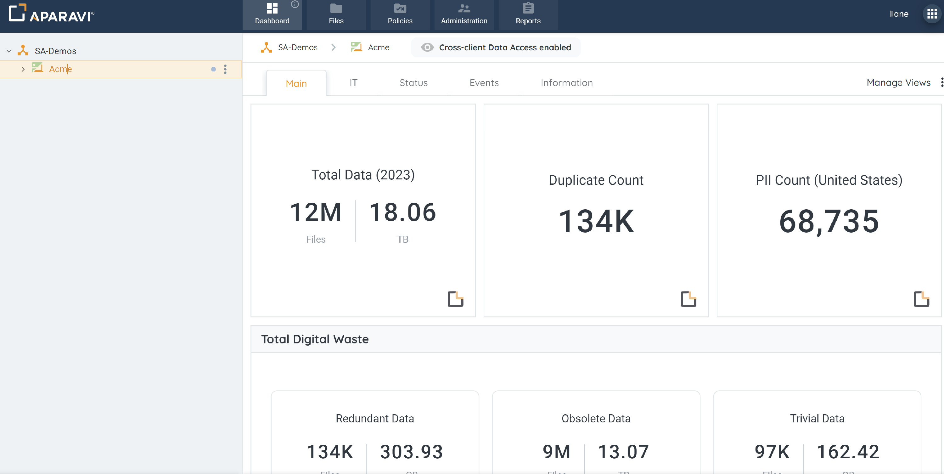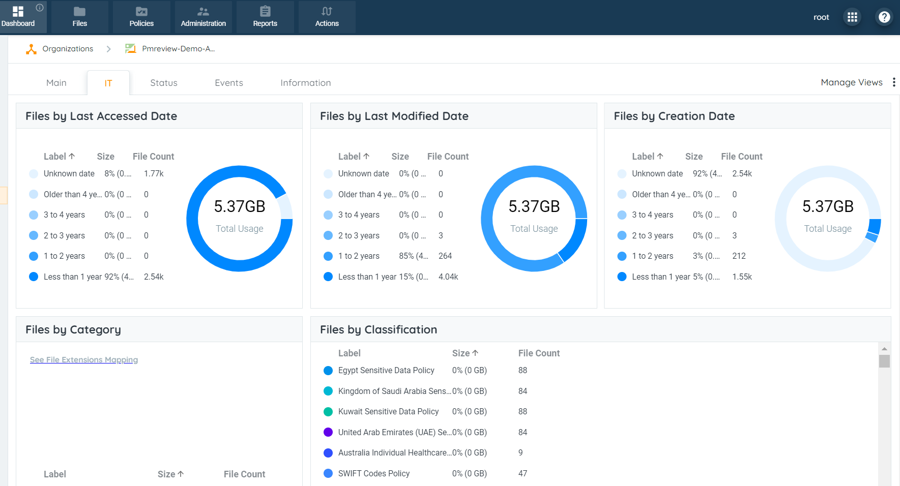 The IT subtab provides the insights of the Data Estate scanned for the node selected. There are various widgets within this IT Tab which provides information about