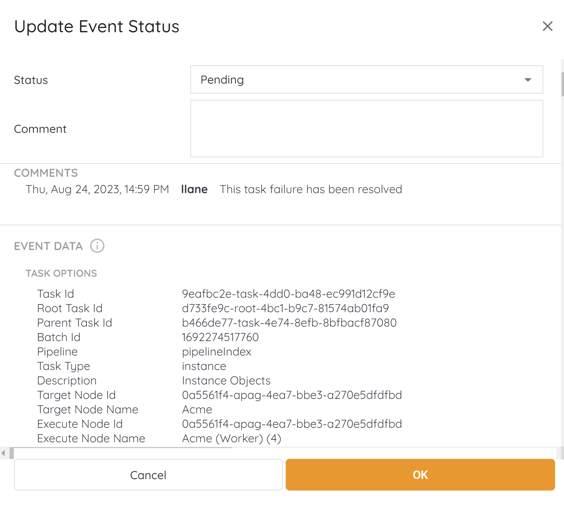 - To view the details about any event, click on the event’s name and the Update Event Status pop-up box will appear, displaying all the information regarding the event.