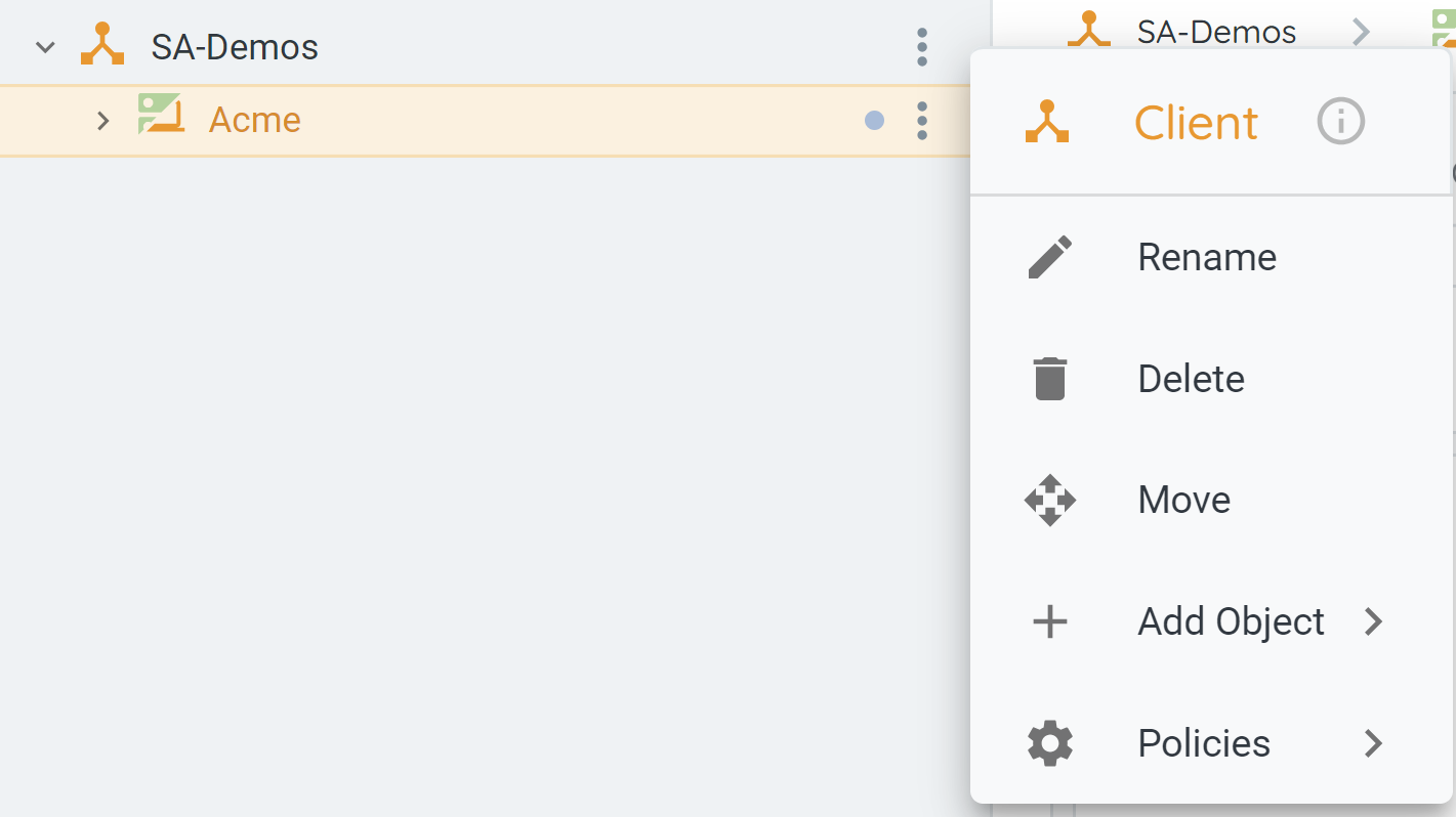 - The Object tree is unique to each environment and grows as you add objects to your Aparavi deployment. Access administration options at the top client level by clicking the three dots next to the client or right-clicking on the object.