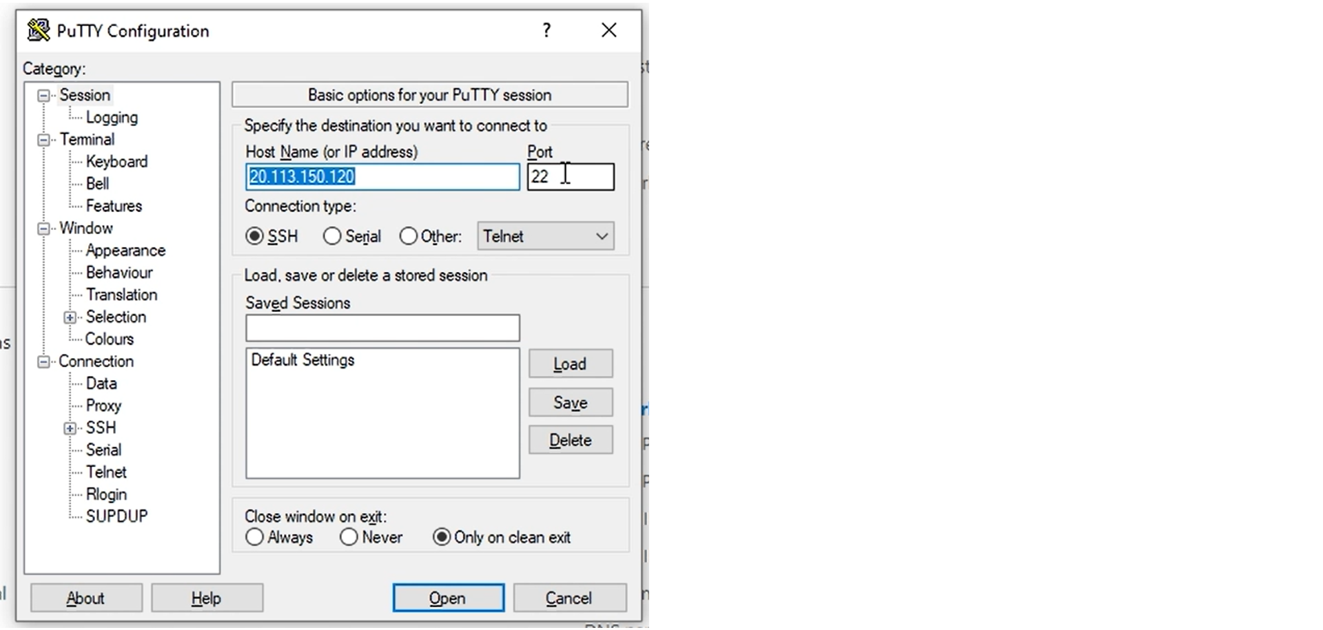 Input the IP/DNS name of the VM you want to connect to and input port 22 ( SSH port ) and click “ Open ”