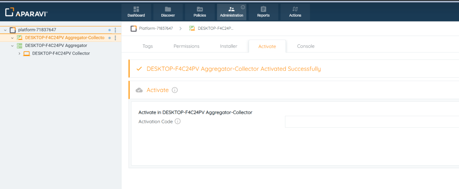 This process also applies to our traditional On-Prem Connected Deployment, where the platform, hybrid, and collectors are installed separately. In these cases, activation codes are received via email and can be entered into the product. Once the code is provided, users can check the Activate tab of the platform, hybrid, or collector to confirm that activation has been completed successfully.