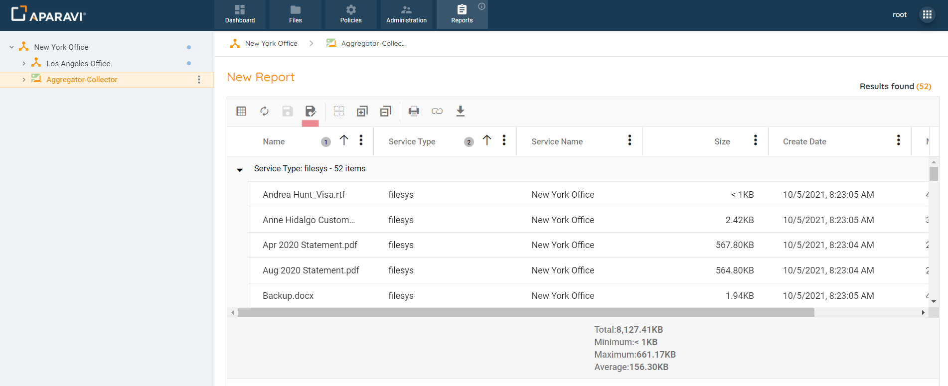 Custom reports help users find all about their unstructured data tailored to their needs. This feature could be customized using the elaborative search criteria across the entire system or a specific folder, depending on the selected node or folder. Saving the query as a report enables quick reporting without repeating the steps. Saved reports can show real-time results, be exported to PDF or Excel, or shared with other APARAVI users within the system.