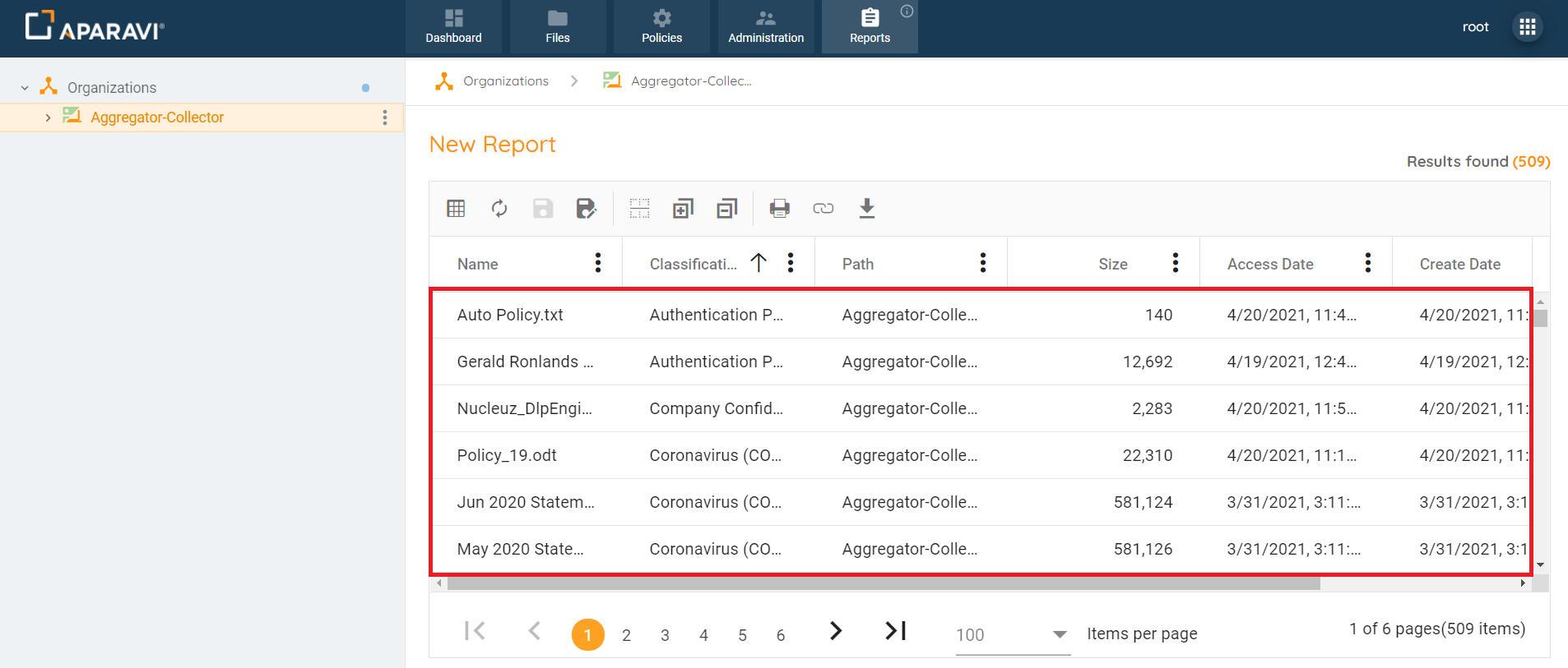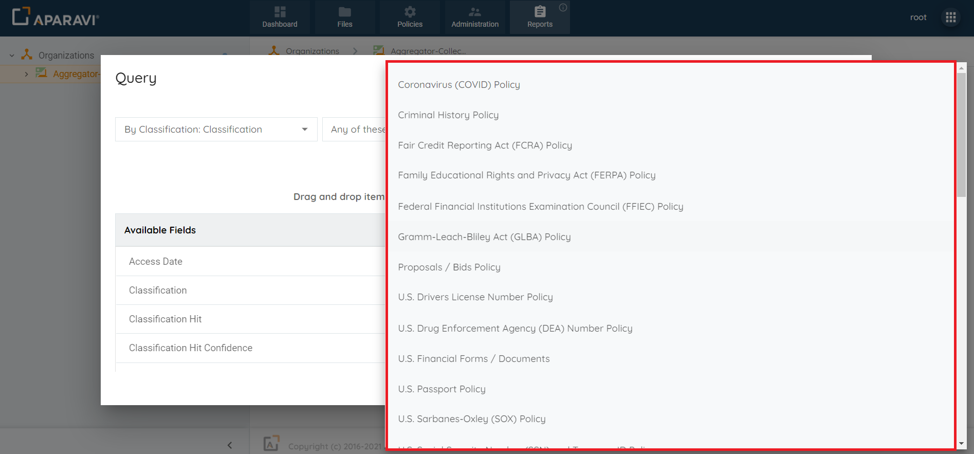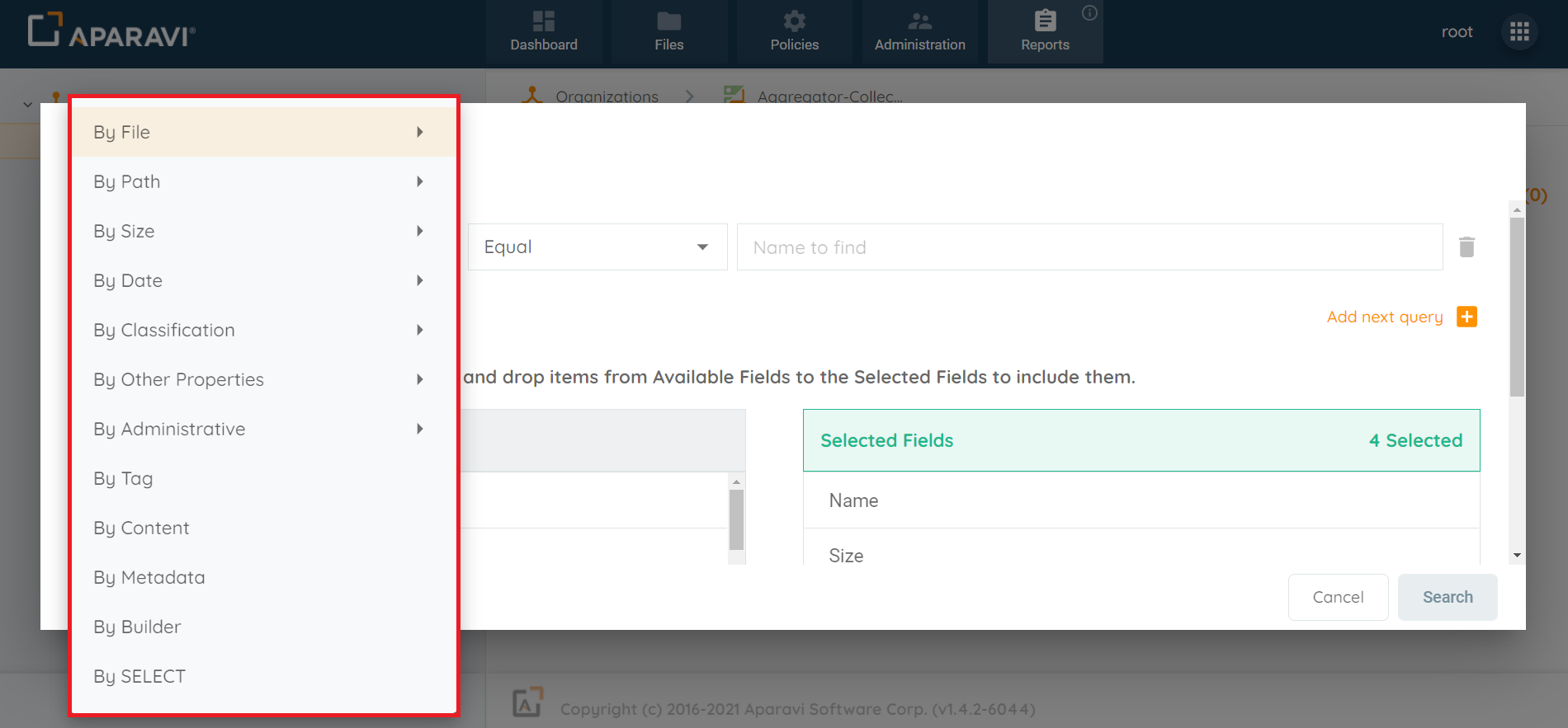 AQL stands for APARAVI Query Language and using our pre-defined set of Reports, it is possible to get the results even faster. You can create reports with different search fields. These pre-set list of reports or elaborative list of search criteria’s help you narrow down your search to understand the data better. The results of the reports could be saved as Excel or PDF files for easy use.