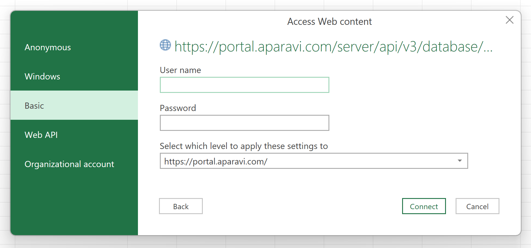 - The Access Web Content window appears. Select Basic option and enter your username and password.