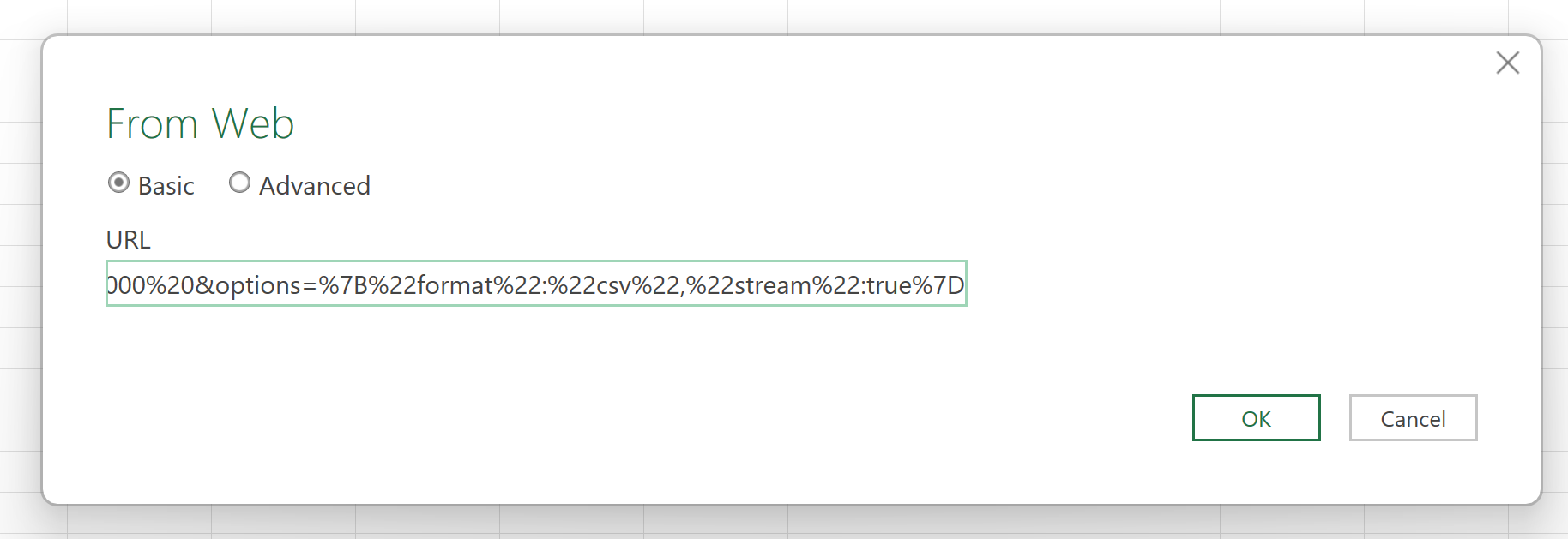 - Insert the URL in the From Web window, URL field. The Basic option is selected by default. Click OK.