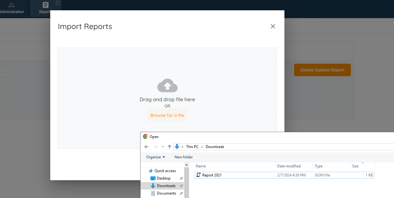 - Drag & Drop the JSON file into the Import Reports pop-up box or click on Browse for a file button and select the file from the local directory.