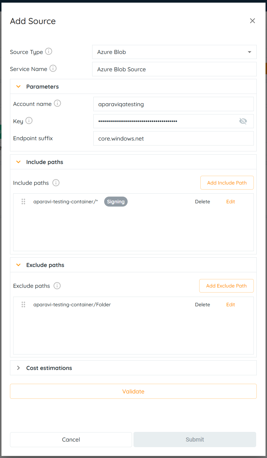 - Include Paths: Click on the Include Paths section and include at least one path. Although multiple include paths can be entered, the system has an order of precedence for the paths that must be followed. The Include path should start with container name: BlobContainer/FolderName/*.