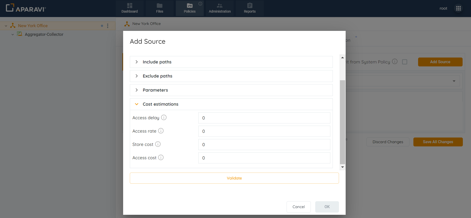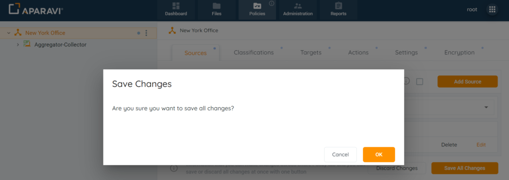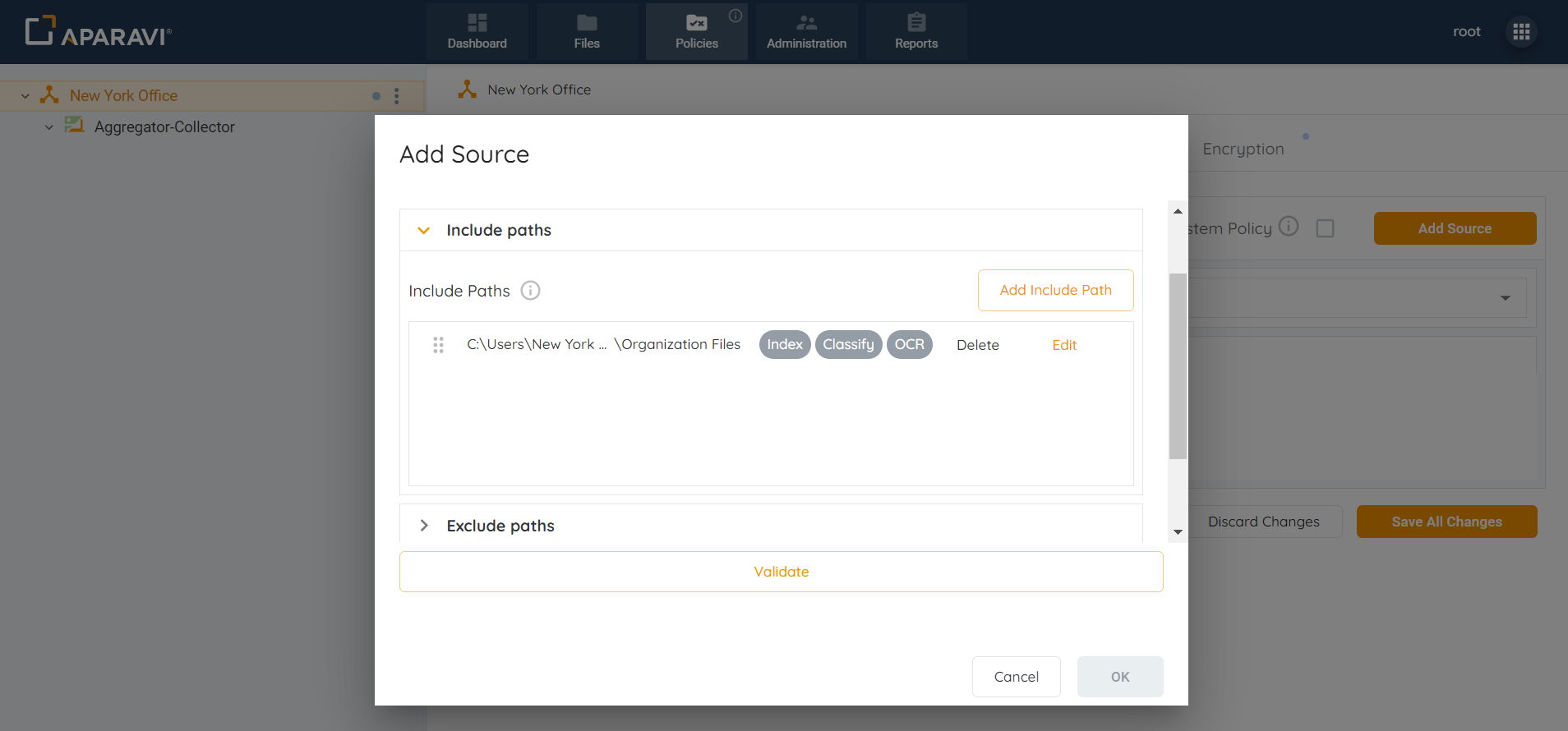 - Navigate to the “Policies” menu and select the “Sources” tab. While on this tab click on “Add Source“ (Note: the filesystem to be scanned must be running the Aparavi Collector Service)