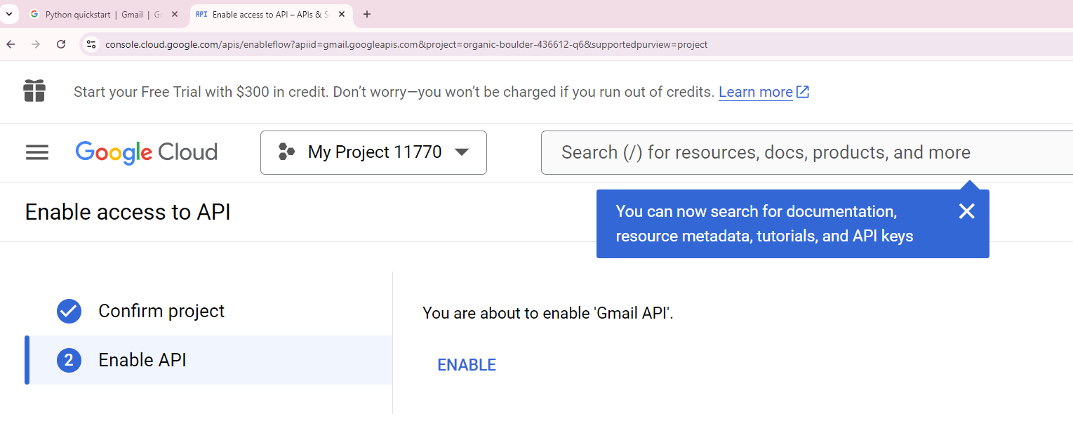 - In the Google Cloud console, enable the Gmail API: https://console.cloud.google.com/flows/enableapi?apiid=gmail.googleapis.com