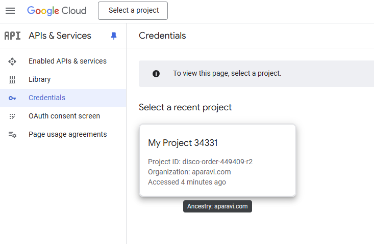 - Select “Credentials”: https://console.cloud.google.com/apis/credentials