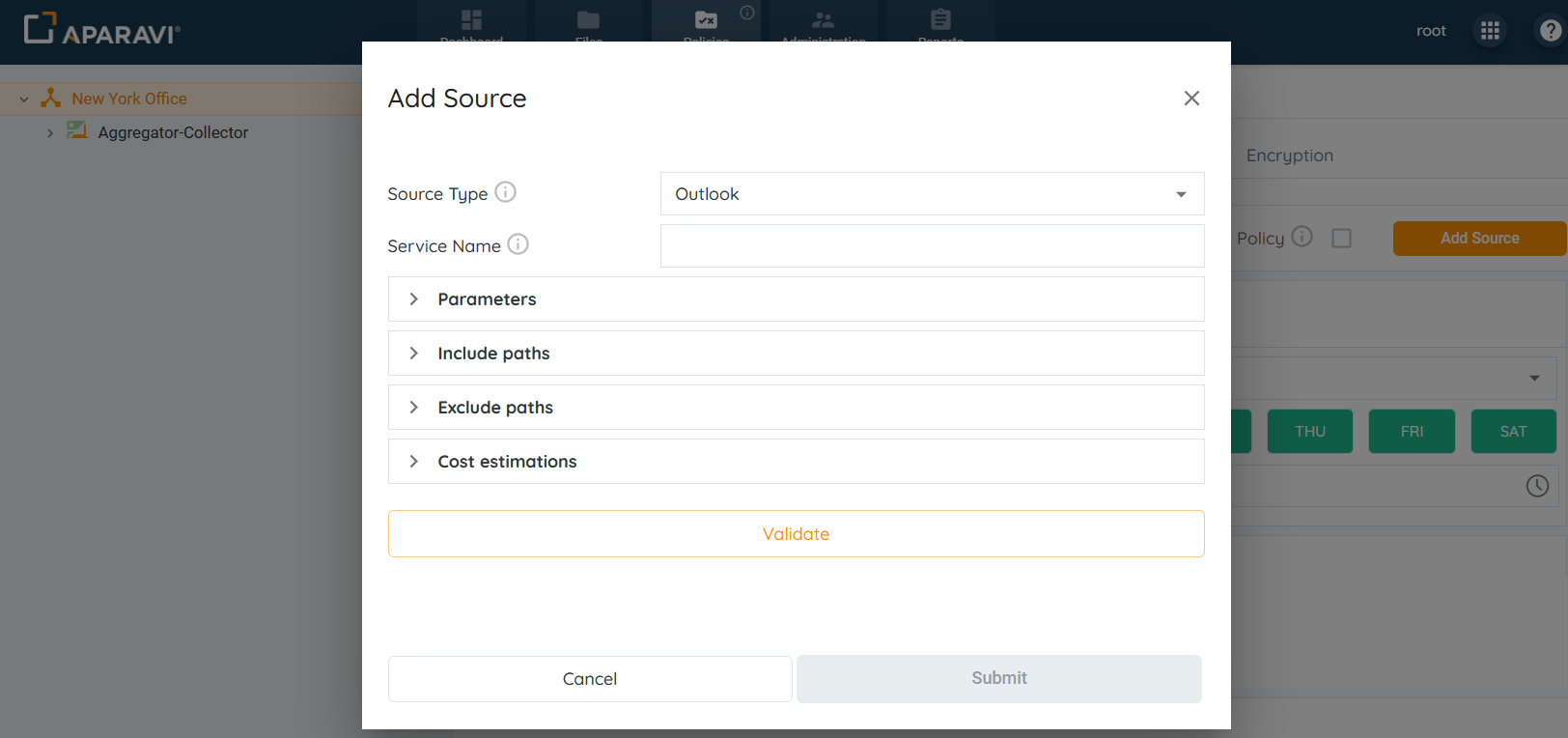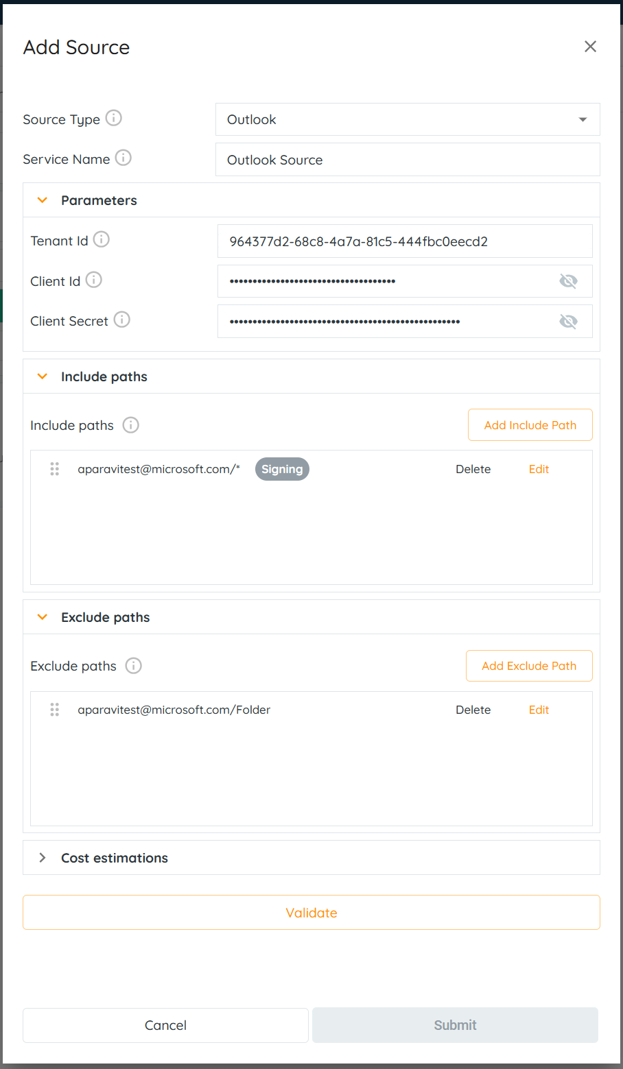 - Provide the necessary information in the fields to set up and configure the Outlook source: