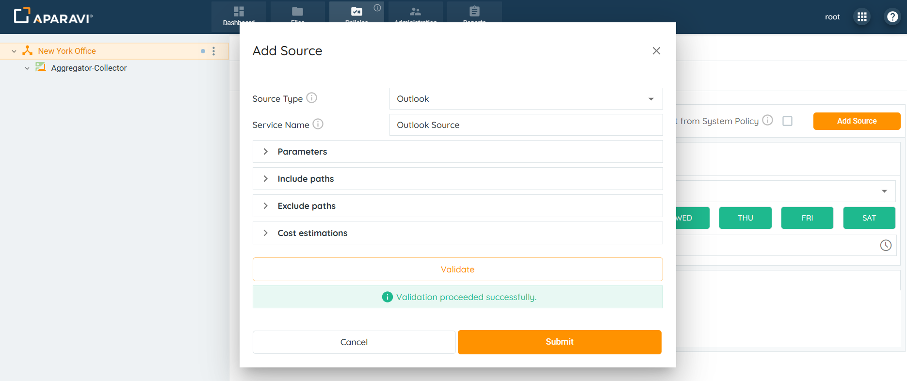 - After completing all sections within the Add source pop-up box, select the Validate button. If the validation was successful, click OK. If the OK button does not activate, this indicates that the credentials are throwing an error and need to be revised before the configuration can progress.