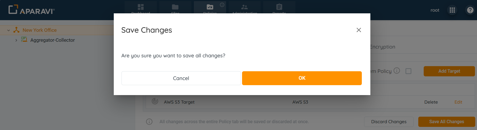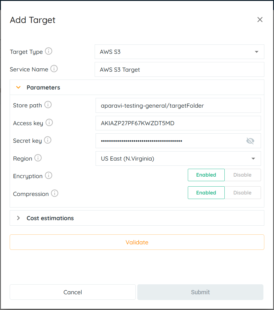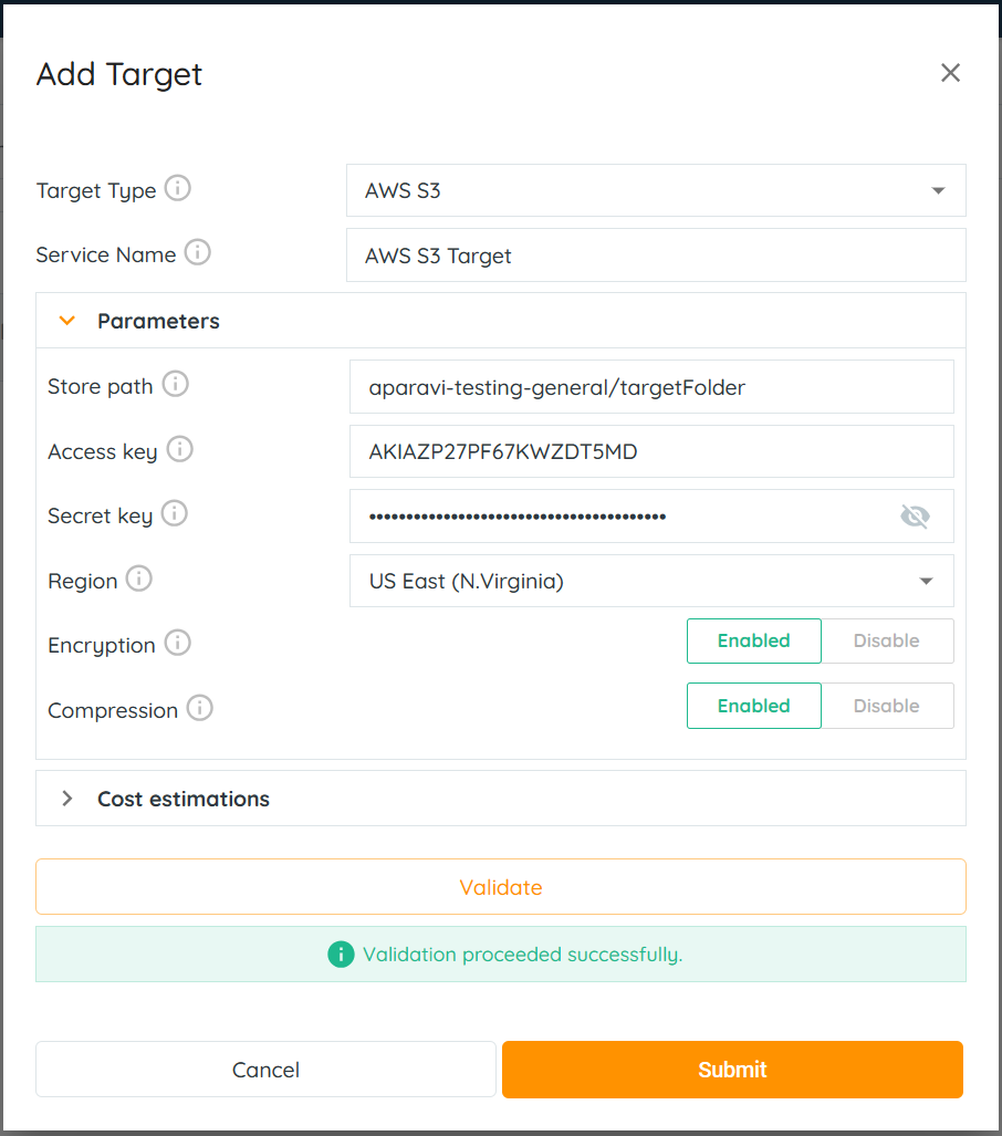 - Once the system has completed validation with the AWS S3 target service, the Submit button will be highlighted in orange to indicate that the button is now active. Click the Submit button in the bottom right corner of the Add Target pop-up box.