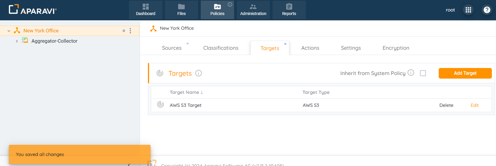 Once all changes have been successfully saved, the AWS S3 target service will appear as an entry under the Targets sub-tab. Also, an alert message will display in the bottom left-hand corner to indicate that the target service has been successfully configured.
