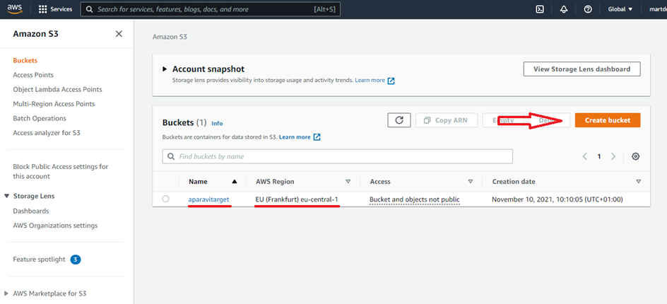 - Enter the bucket name and AWS region in the corresponding fields on the Aparavi platform.