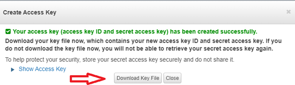 - Download your Access and Security Keys and use them as required to configure the S3 Target service.