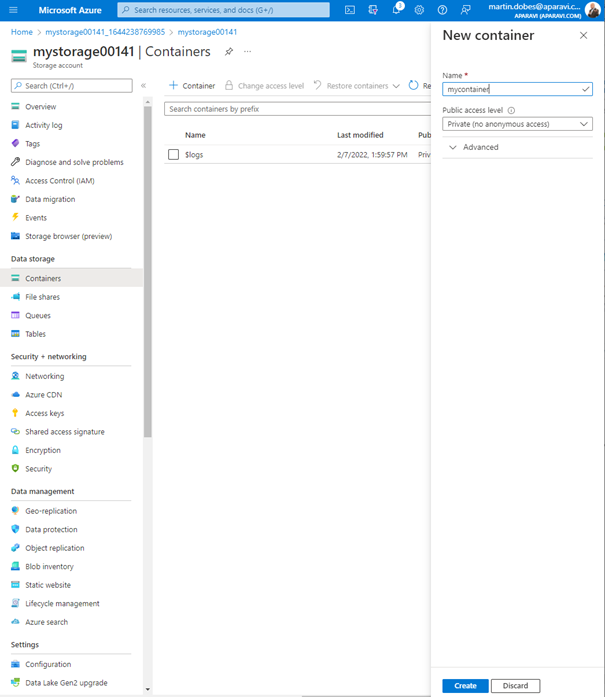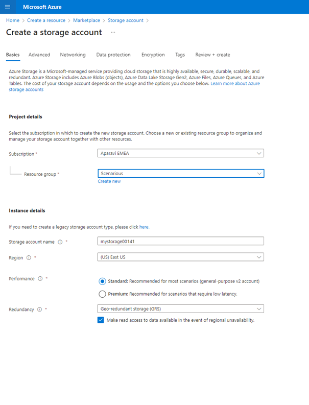 - Define a storage account name. In this example, we have named the storage account “mystorage00141”.