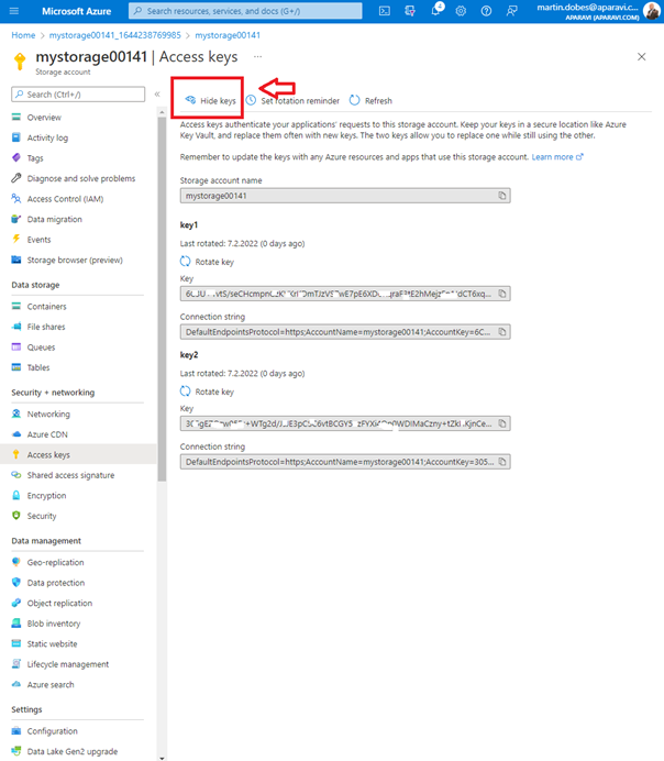 - Select “Access Keys > Show Keys” to make the keys visible. Then copy either “key1” or “key2” to the clipboard. You will need it later in the Aparavi Platform dialog box (as the Key).