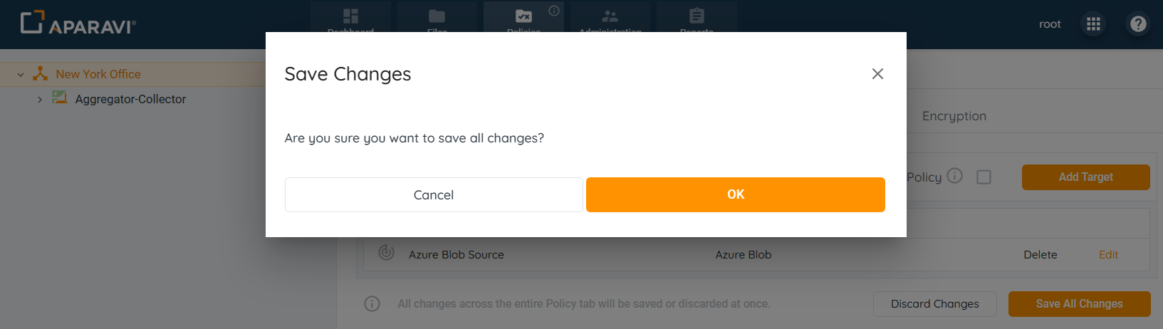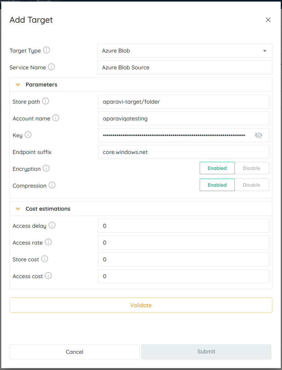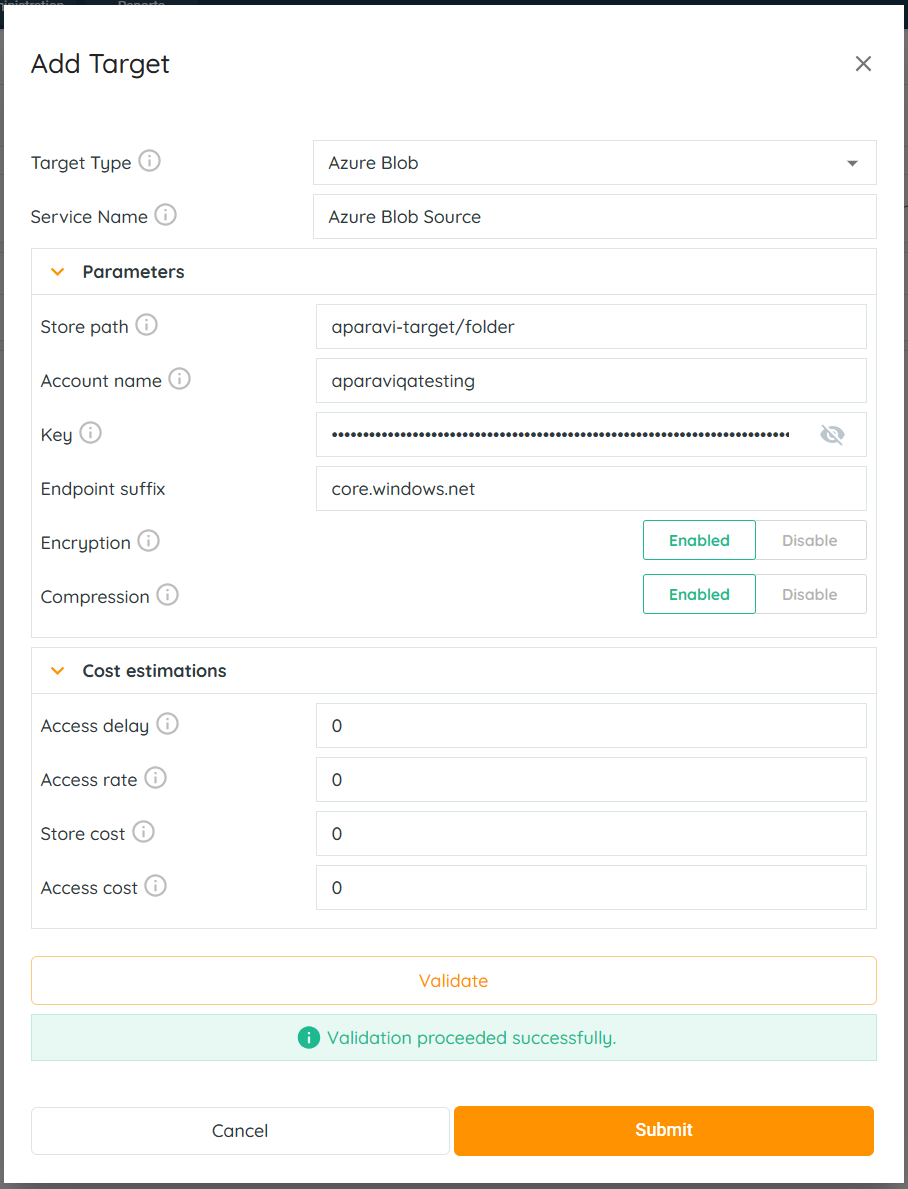 - Once the system has completed validation with the Azure Blob target service, the Submit button will be highlighted in orange to indicate that the button is now active. Click the Submit button in the bottom right corner of the Add Target pop-up box.