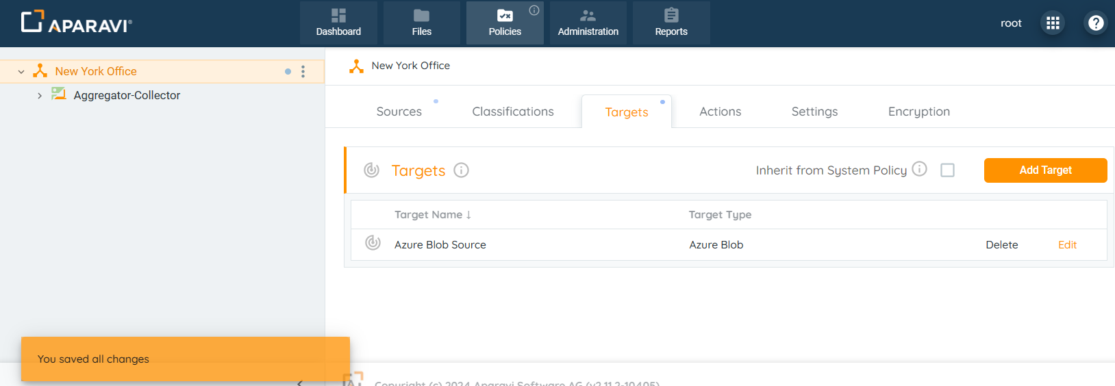 Once all changes have been successfully saved, the Azure Blob target service will appear as an entry under the Targets sub-tab. Also, an alert message will display in the bottom left-hand corner to indicate that the target service has been successfully configured.