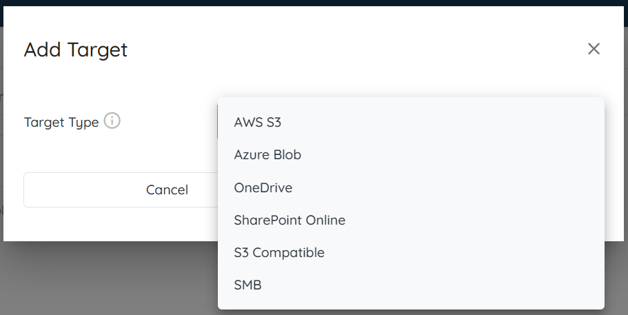 - Inside the Add Target pop-up box, click the Target Type field and select the Azure Blob option.